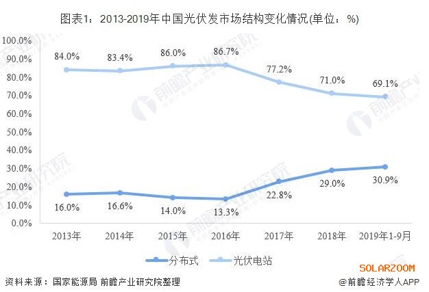 不同于光伏電站,分布式光伏發(fā)電是指在用戶所在場地或附近建設(shè)運(yùn)行,以用戶側(cè)自發(fā)自用為主、多余電量上網(wǎng)且在配電網(wǎng)系統(tǒng)平衡調(diào)節(jié)為特征的光伏發(fā)電設(shè)施。近年來,國家對分布式光伏發(fā)電系統(tǒng)一直采取積極鼓勵的態(tài)度,并出臺了一系列扶持措施。2016年底出臺的《電力發(fā)展“十三五”規(guī)劃》對分布式光伏設(shè)定了超常規(guī)發(fā)展目標(biāo):“2020年,太陽能發(fā)電裝機(jī)達(dá)到1.1億千瓦以上,分布式光伏6000萬千瓦以上”。隨著各地分布式光伏發(fā)電建設(shè)的推進(jìn)。我國光伏發(fā)電市場結(jié)構(gòu)發(fā)生改變,尤其是2016年以來,我國分布式光伏市場份額已經(jīng)由13.3%提升至30.9%。