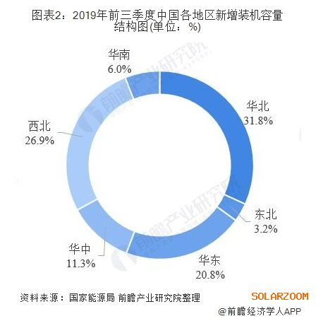 從新增裝機(jī)布局看,我國光伏發(fā)電由西向東的發(fā)展步伐穩(wěn)步推進(jìn),2019年前三季度,華北地區(qū)新增裝機(jī)508.6萬千瓦,占全國的31.8%;東北地區(qū)新增裝機(jī)51.2萬千瓦,占全國的3.2%;華東地區(qū)新增裝機(jī)332.2萬千瓦,占全國的20.8%;華中地區(qū)新增裝機(jī)180.9萬千瓦,占全國的11.3%;西北地區(qū)新增裝機(jī)430.8萬千瓦,占全國的26.9%;華南地區(qū)新增裝機(jī)95.5萬千瓦,占全國的6%。